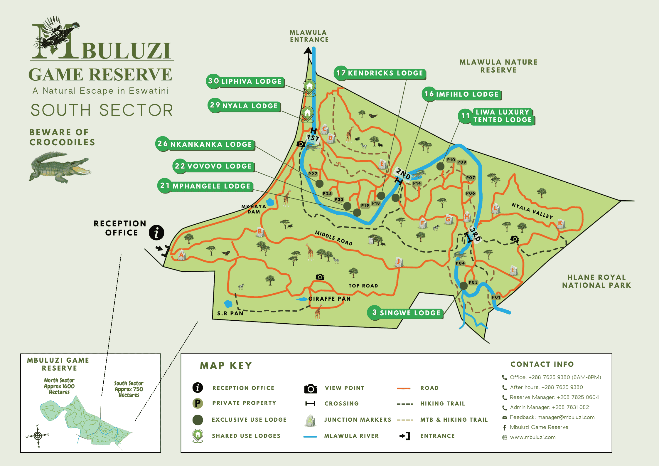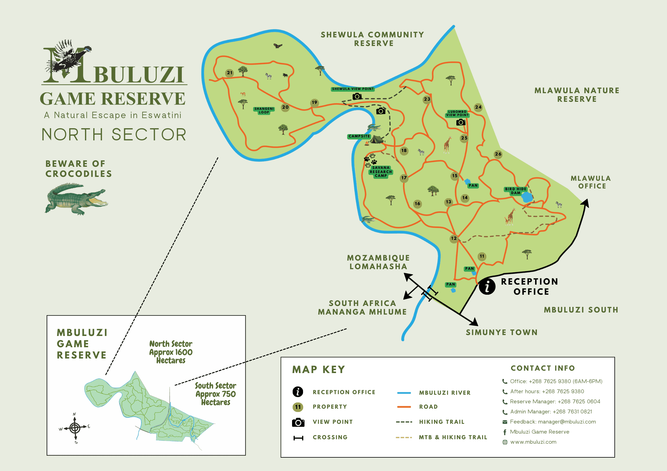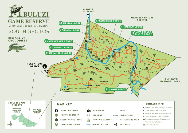 Map of the Southern section of Mbuluzi including our self-catering lodges, rivers, game drive roads, view points and popular hiking & mountain biking trails.